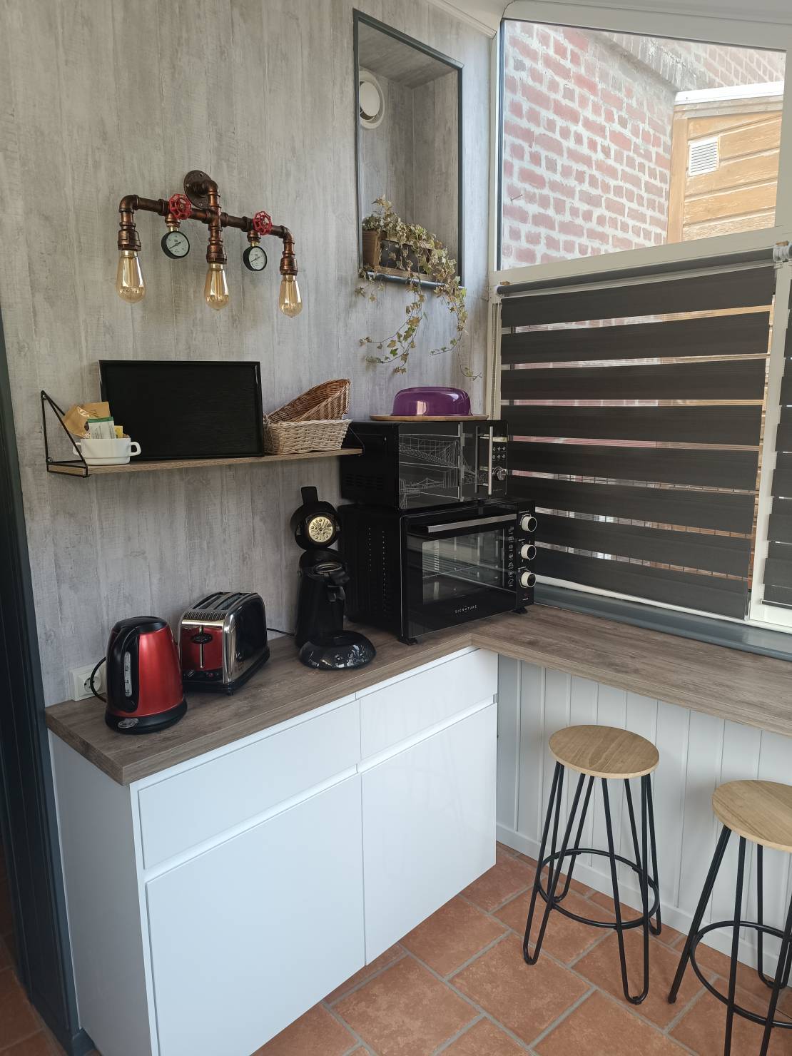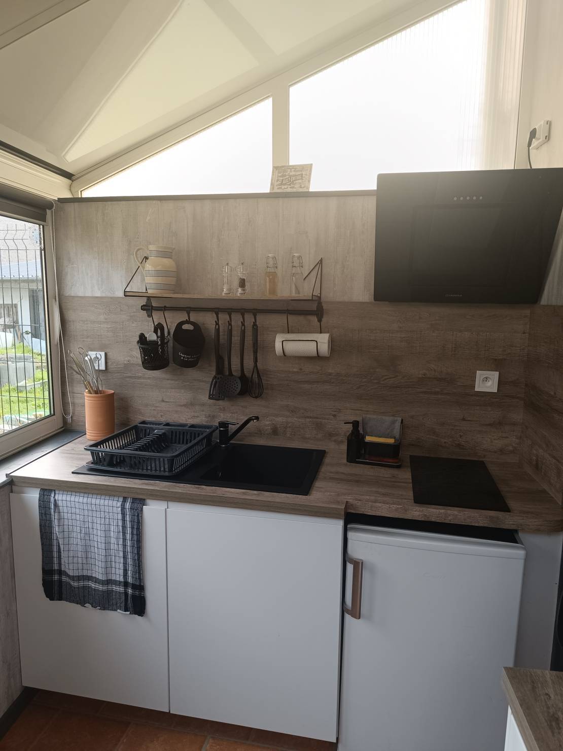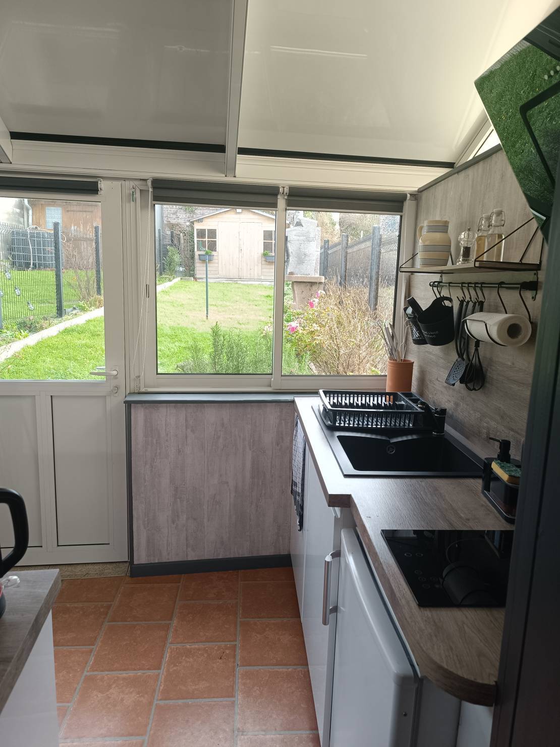 Ce grand studio, au 1er étage, se compose d'une pièce de vie avec couchage, d'un couloir d'environ 5,5 M2, pouvant servir de chambre passante, avec accès à une salle d'eau / wc et à une véranda qui est aménagée en cuisine, toute équipée. Celle ci donne sur un beau jardin et un cabanon est présent.