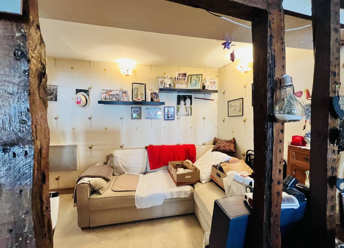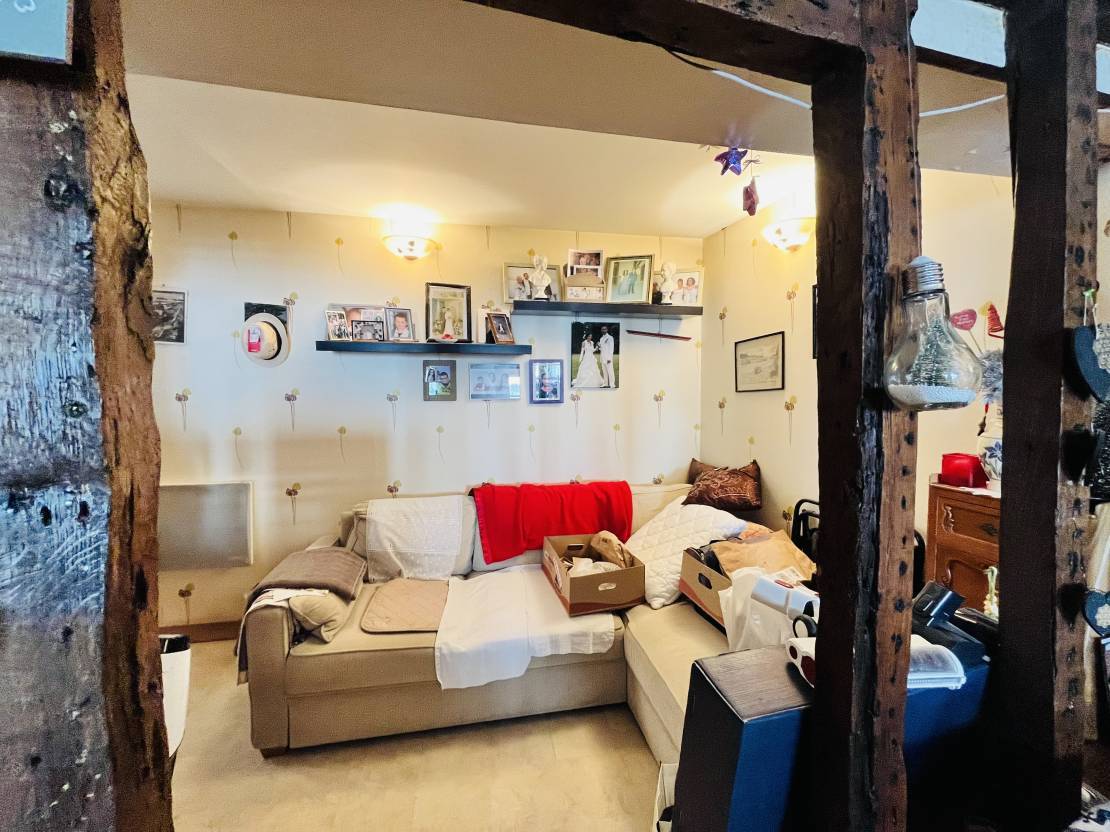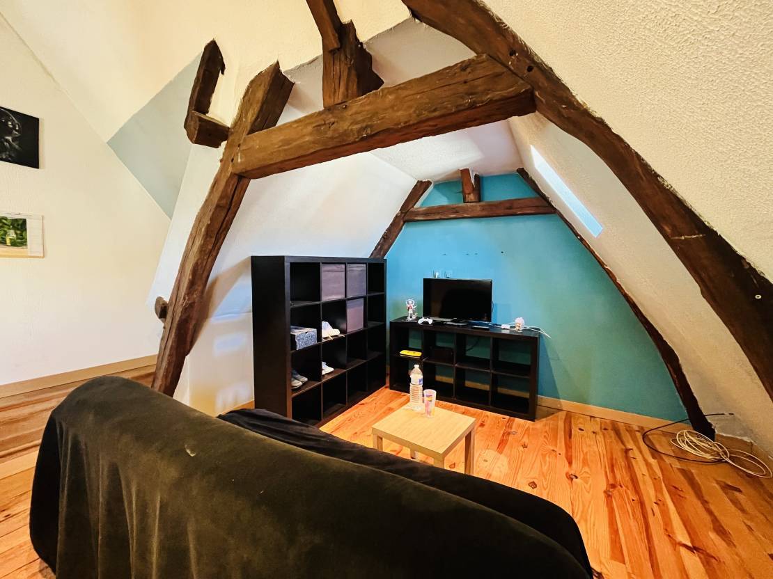 Au deuxième étage : un grand T2 comprenant un palier, une grande pièce de vie avec cuisine ouverte, une grande chambre et une salle de bain.