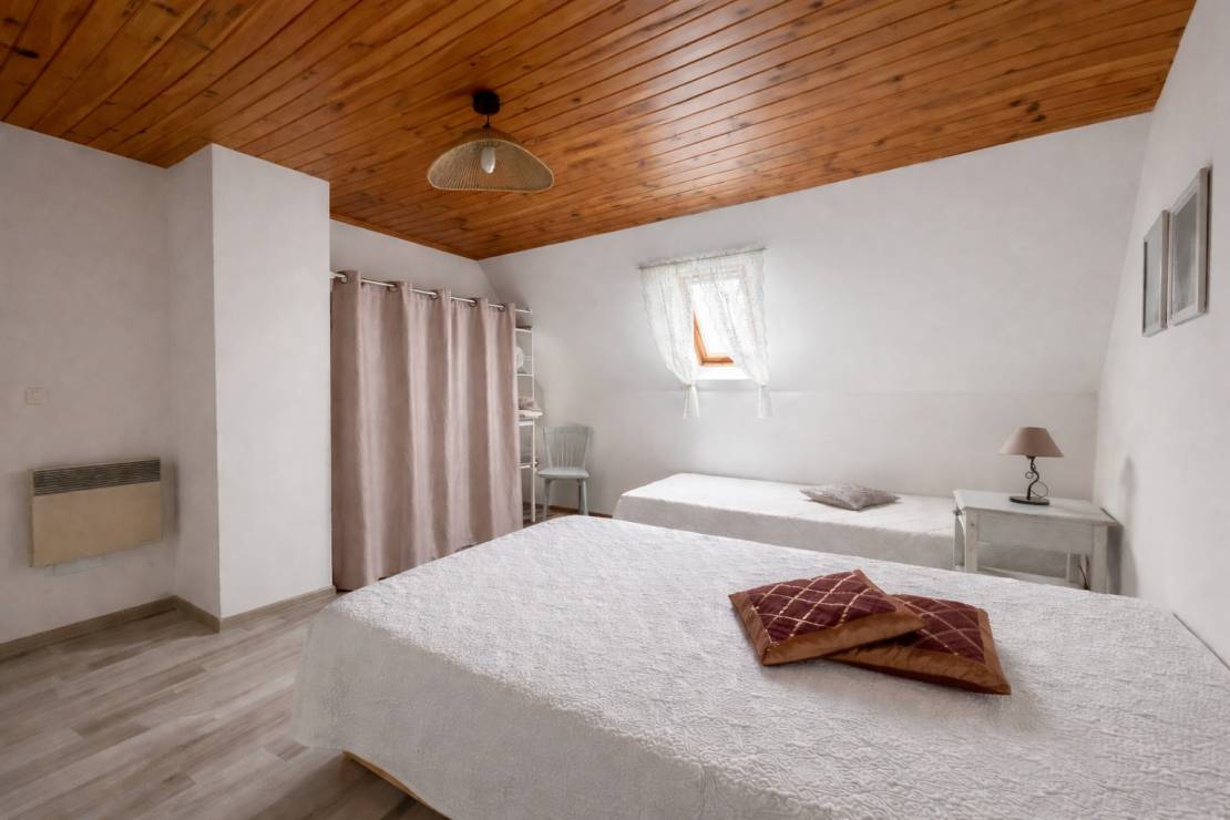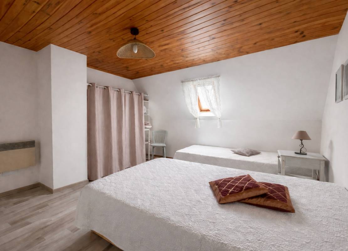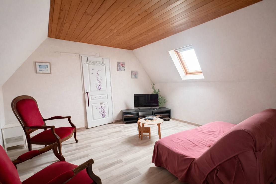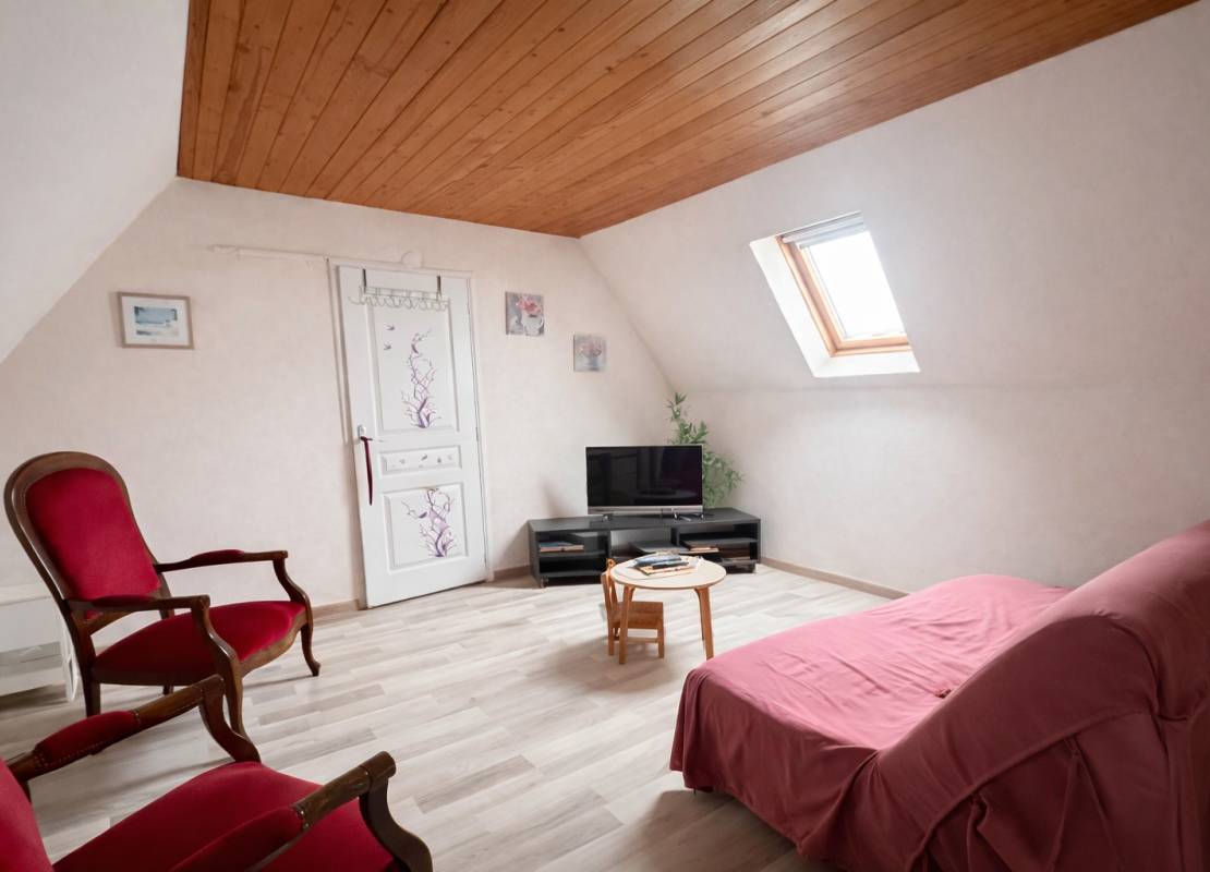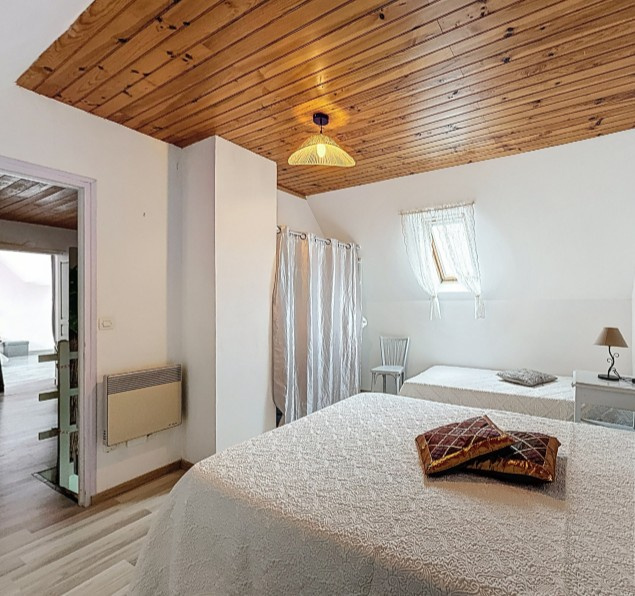 À l’étage, l’espace nuit se compose d’une suite parentale confortable avec WC et lavabo, d’une seconde grande chambre, ainsi que d’un vaste palier pouvant être aménagé en chambre supplémentaire ou en espace polyvalent selon les besoins.