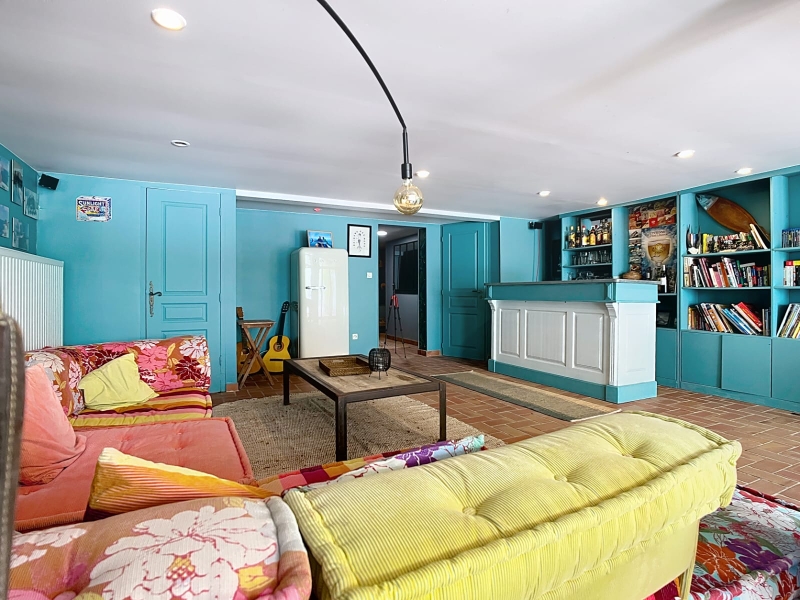 La maison principale séduit par ses volumes et son authenticité. Elle propose un beau séjour lumineux avec cheminée et poutres apparentes, une cuisine entièrement équipée, ainsi que cinq chambres, chacune disposant de sa salle d’eau privative avec douche et toilettes, garantissant confort et indépendance.