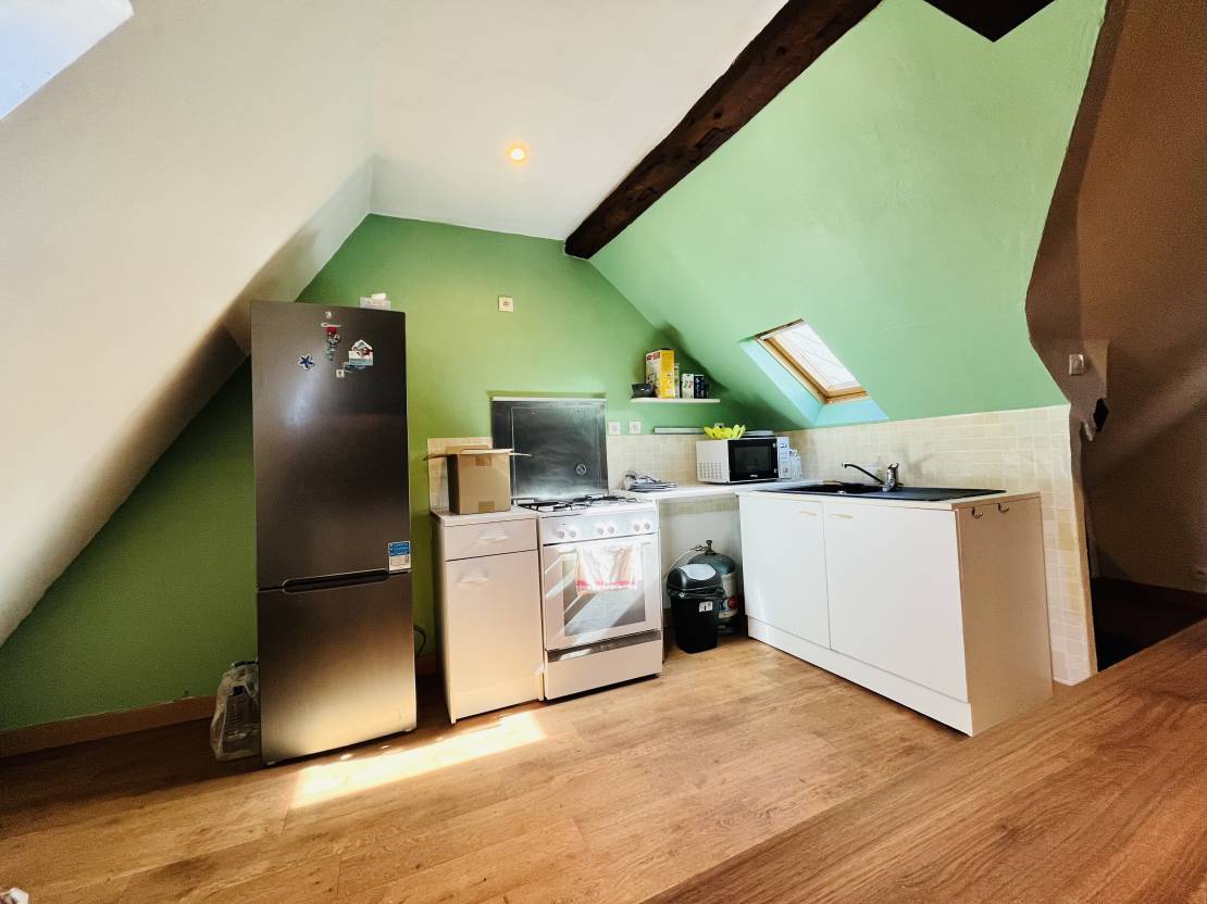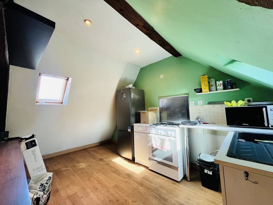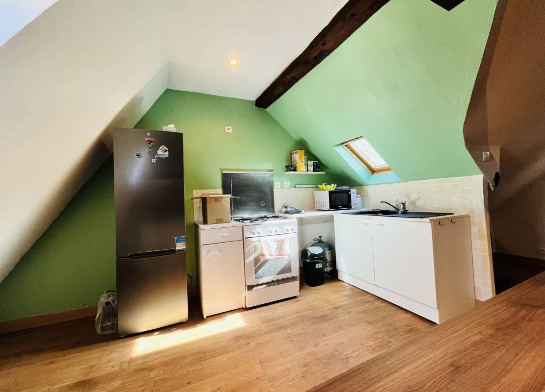 Au deuxième étage : un grand T2 comprenant un palier, une grande pièce de vie avec cuisine ouverte, une grande chambre et une salle de bain.