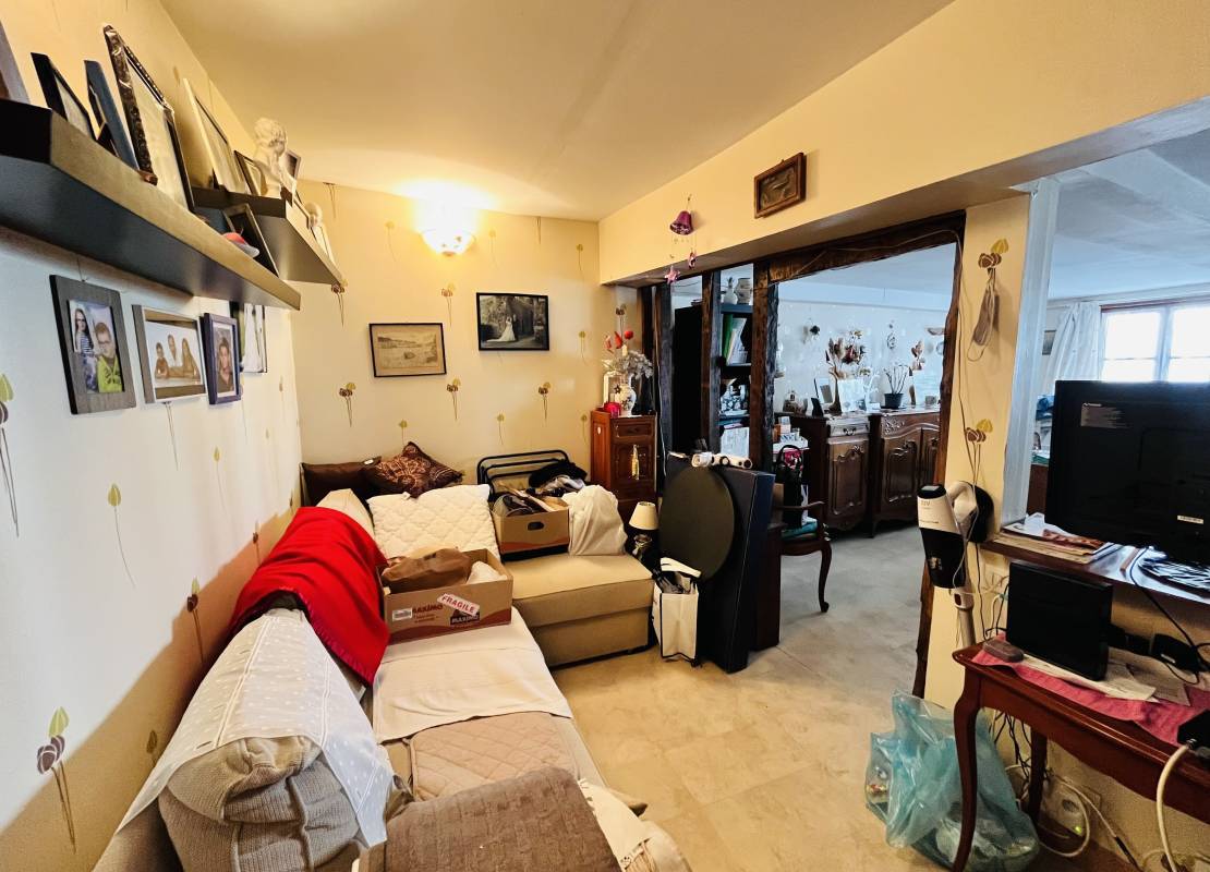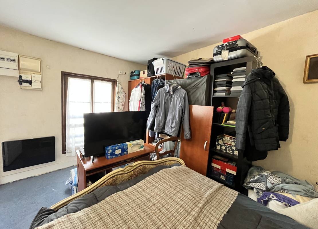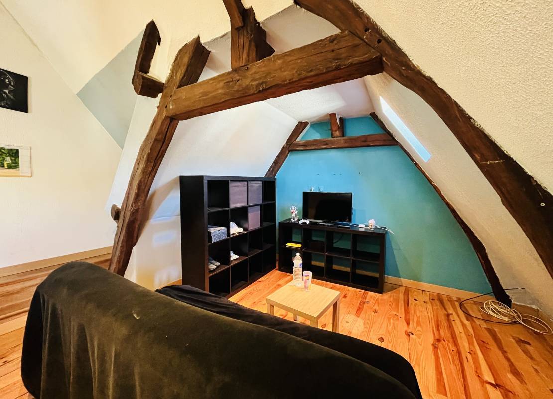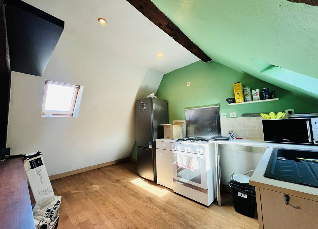 Au deuxième étage : un grand T2 comprenant un palier, une grande pièce de vie avec cuisine ouverte, une grande chambre et une salle de bain.